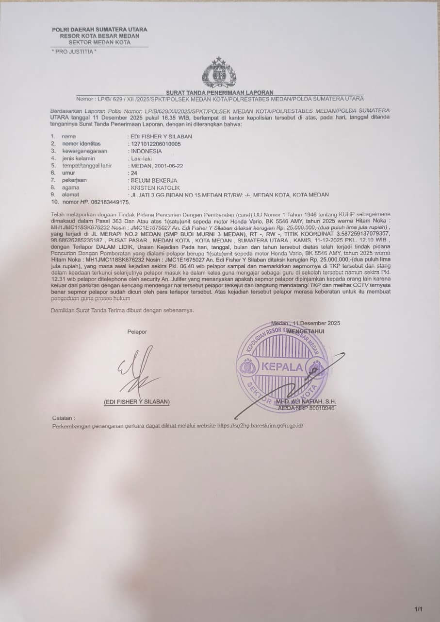 Seorang guru kehilangan sepeda motornya saat sedang mengajar di SMP Budi Murni 3 Medan, Jalan Merapi No. 2, Kota Medan. Peristiwa pencurian tersebut terjadi pada Kamis (11/122025), sekitar pukul 12.11 WIB.