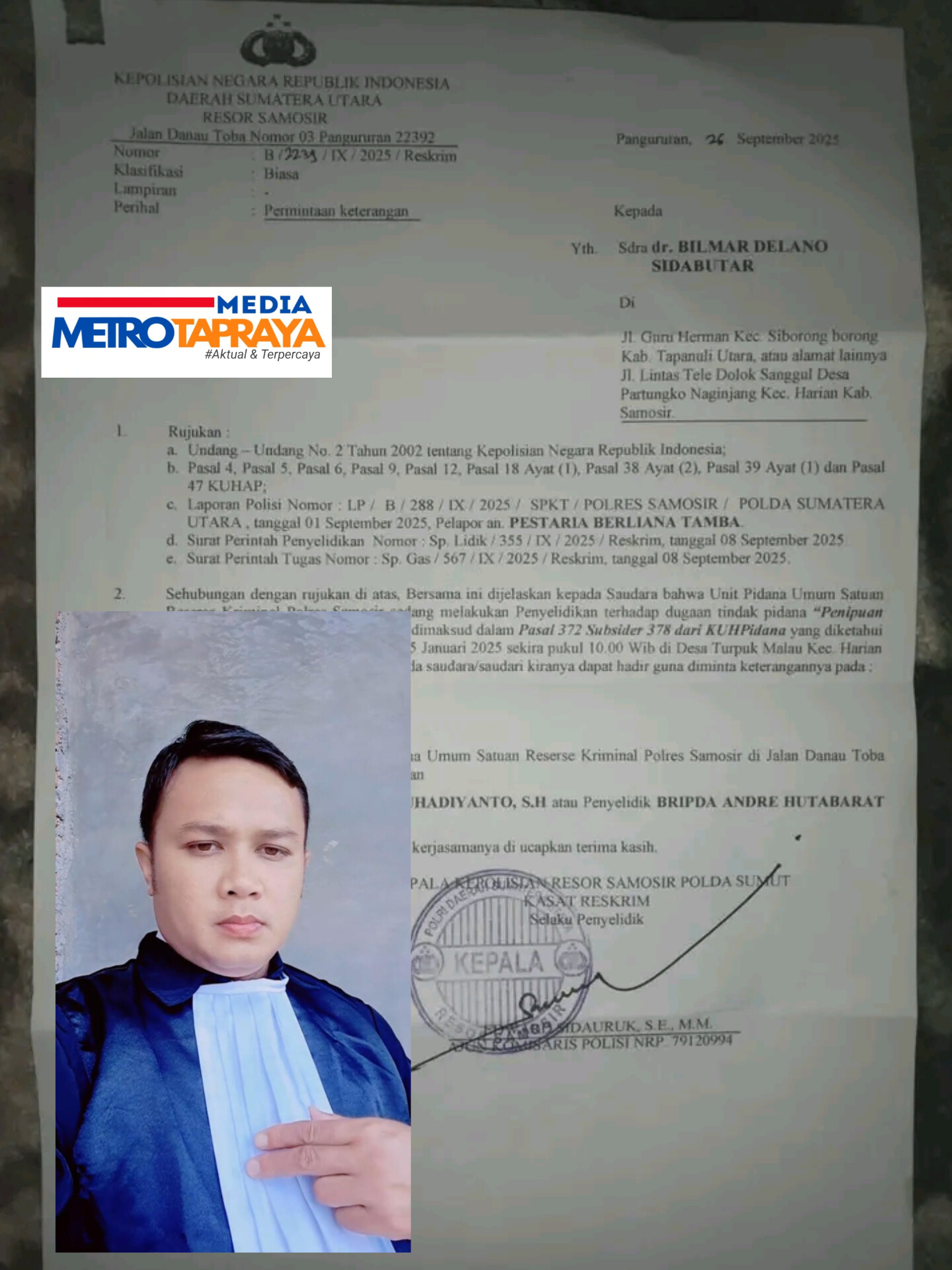 Selamat Malam Pak Kasat, Saya Lamhot Silaban, ST, Pimpinan Redaksi Investigasifakta.news . Sesuai informasi LP Nomor : LP/B/288/IX/2025/SPKT/Polres Samosir dari Sdri Pestaria Tamba ke Polres Samosir yang melaporkan Bahwa ada Kehilangan Aset di Puskesmas Harian.